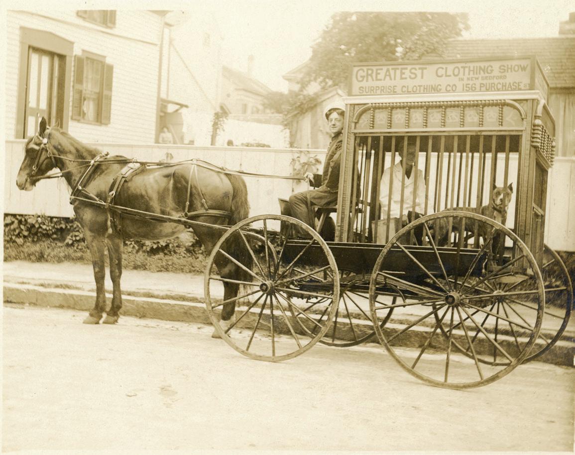 By all accounts, Bloomingdale was a character with award-winning window displays, parade floats, and other dynamic public marketing techniques, including photography. This photograph appears to fall into the latter category. It shows a horse-drawn wagon with a circus cage containing a young boy and a bull terrier dog. The sign above the cage reads: “GREATEST CLOTHING SHOW/ IN NEW BEDFORD/ SURPRISE CLOTHING CO/156 PURCHASE ST. The driver appears to wear a ringmaster’s suit.