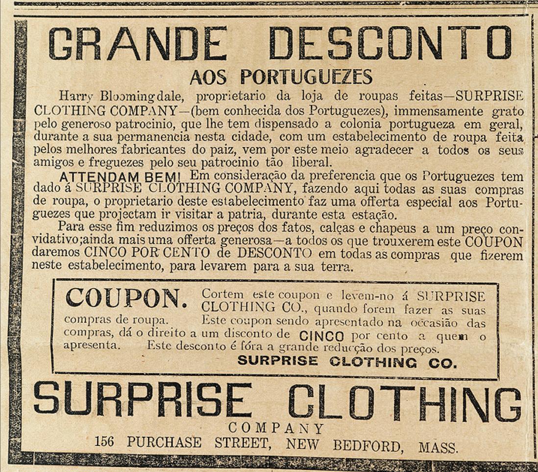 Surprise Clothing Company, 156 Purchase St., New Bedford, MA, Harry Bloomingdale, proprietor. Advertisement from the New Bedford Portuguese-language newspaper Progresso, vol 12, no. 48 (January 6, 1906), Francis C. B. Silva, editor, offering discounts to Portuguese clients. NBWM, 2023.58. Gift of Rita Pacheco.