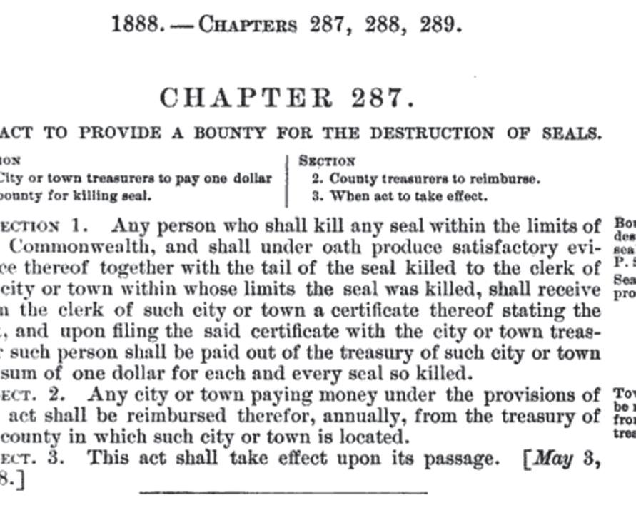 Figure 2. “An Act To Provide A Bounty For The Destruction Of Seals,” State Library of Massachusetts, 1888 Chap. 0287. http:// hdl.handle.net/2452/83944