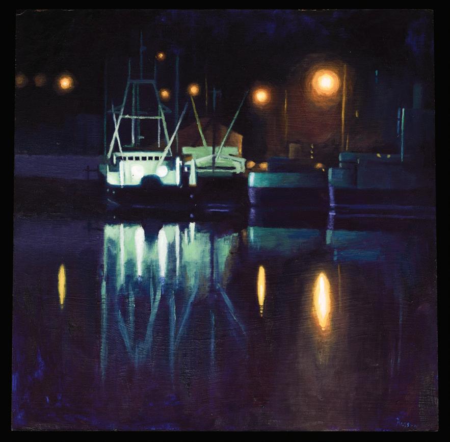 Figure 2. “The lights and colors reflecting on the night water are even more captivating in motion.” Roy Rossow (b. 1975), Night Departure, 2015. Oil on panel, 9 x 8 inches (22.86 x 20.32 cm), NBWM 2022.4.1.