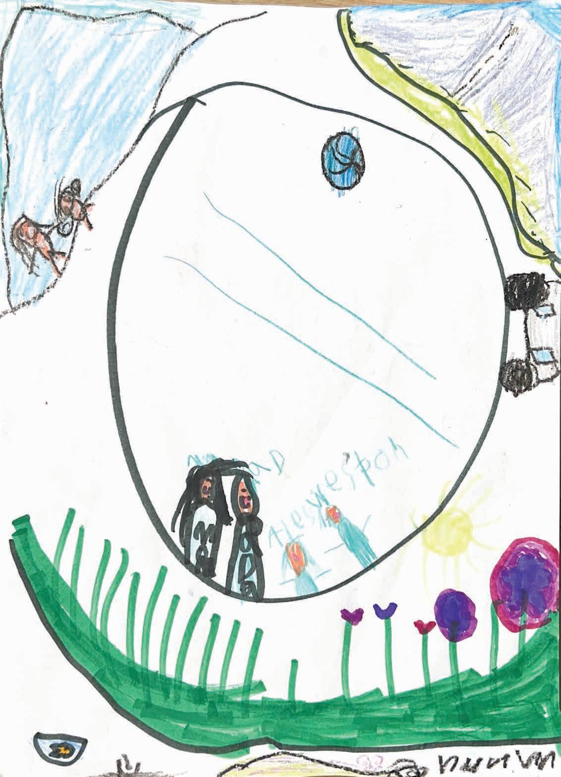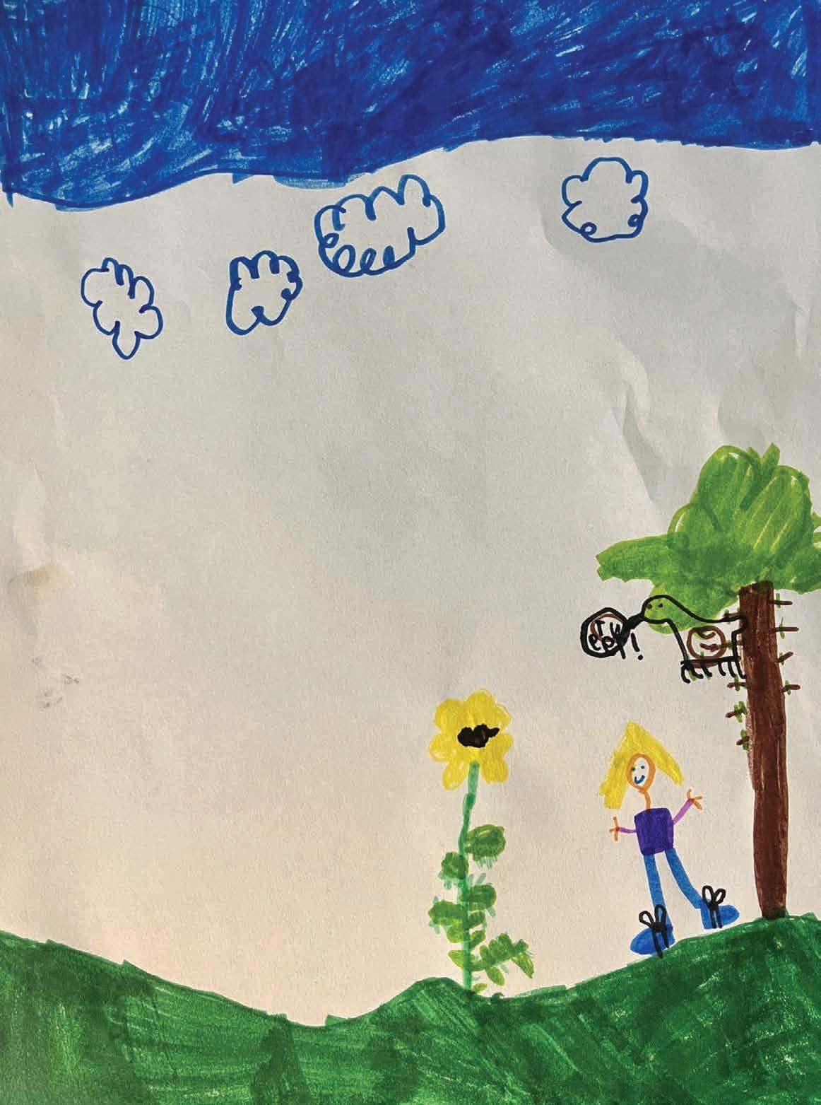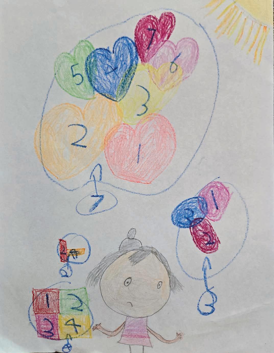 These drawings are things I am doing and things I want to do! I have tried doing a bicycle kick lots of times, and I have a yellow soccer jersey with Ronaldo’s number on it. I wish to be on a soccer team one day, wearing a black and red jersey like in my drawing. I love to swim, it’s my favourite thing to do, and am in swimmer level 5. My drawing is of me under the water holding my breath for a long time. My mom has promised to put me in jiu jitsu soon, and my drawing is of me doing jiu jitsu and karate!