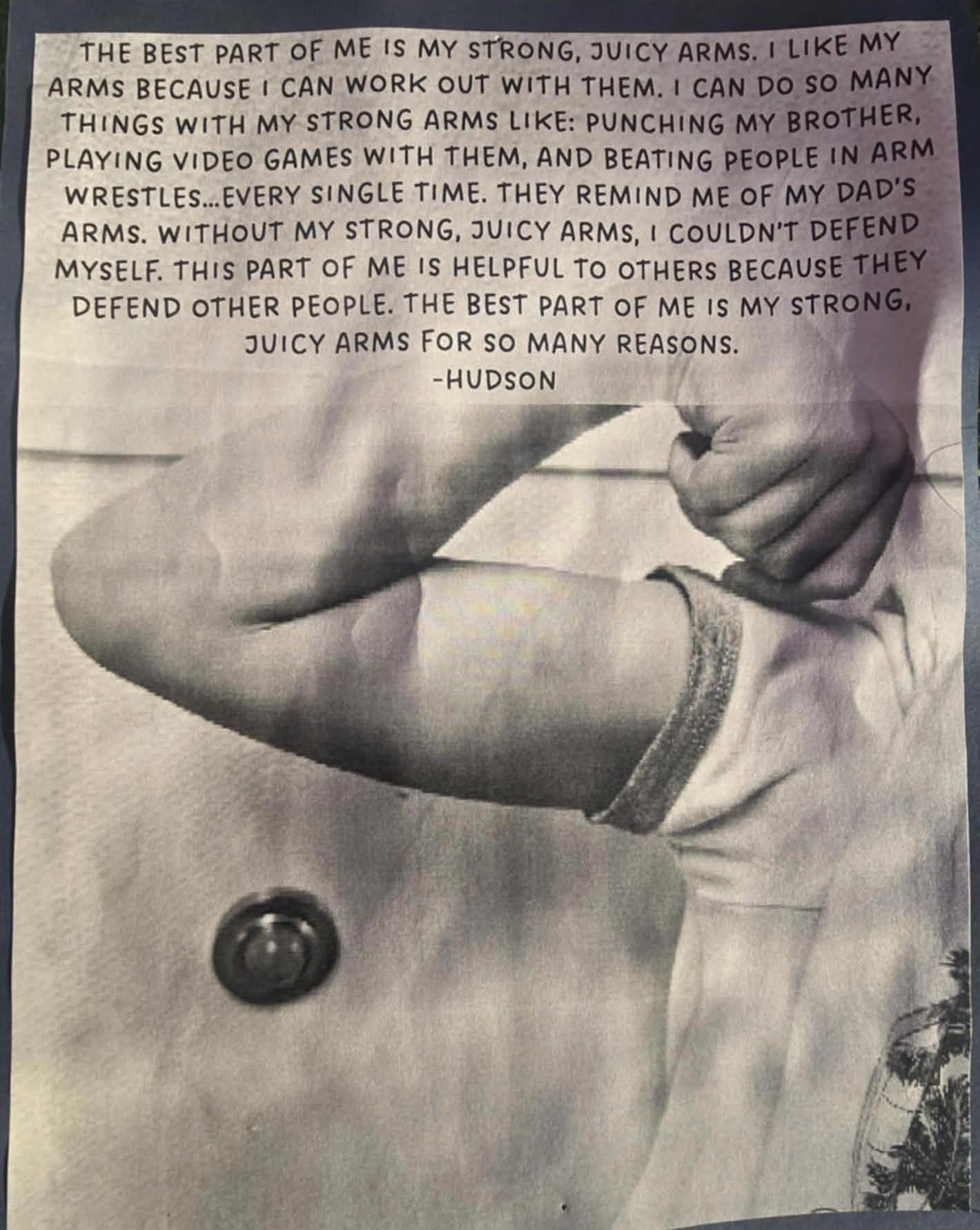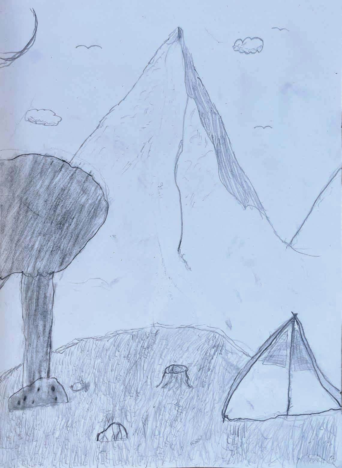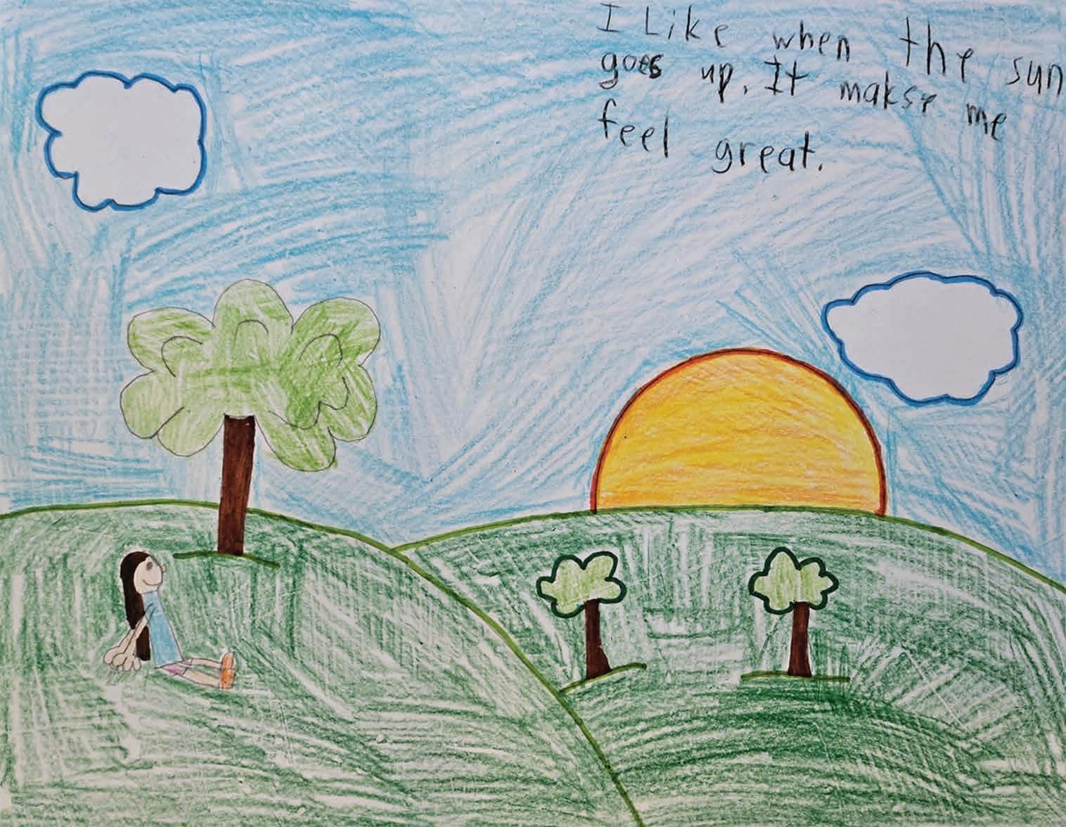 These drawings are things I am doing and things I want to do! I have tried doing a bicycle kick lots of times, and I have a yellow soccer jersey with Ronaldo’s number on it. I wish to be on a soccer team one day, wearing a black and red jersey like in my drawing. I love to swim, it’s my favourite thing to do, and am in swimmer level 5. My drawing is of me under the water holding my breath for a long time. My mom has promised to put me in jiu jitsu soon, and my drawing is of me doing jiu jitsu and karate!