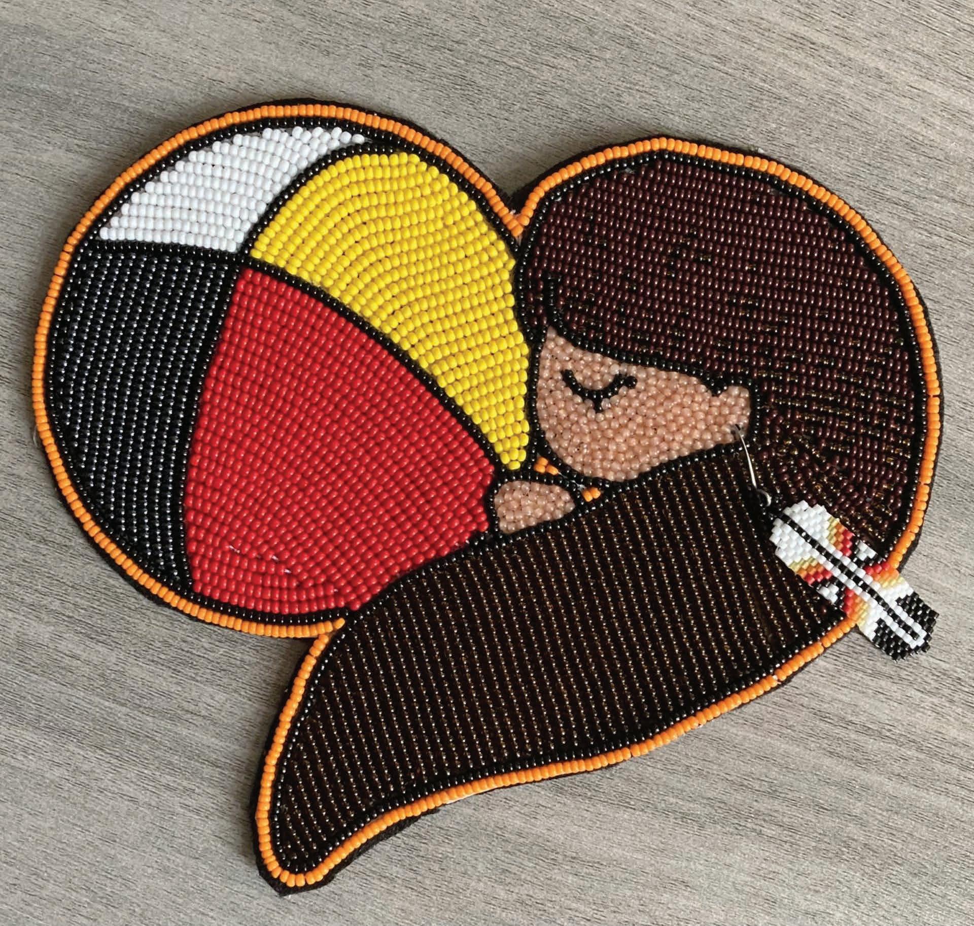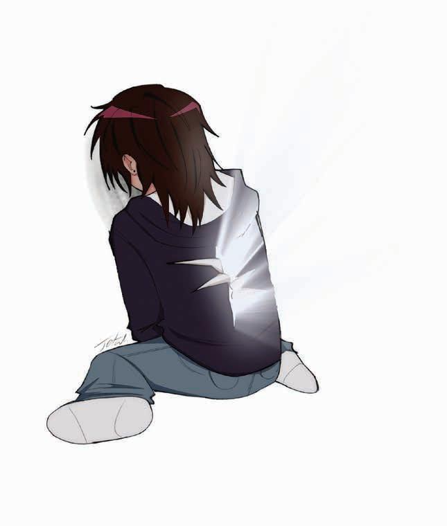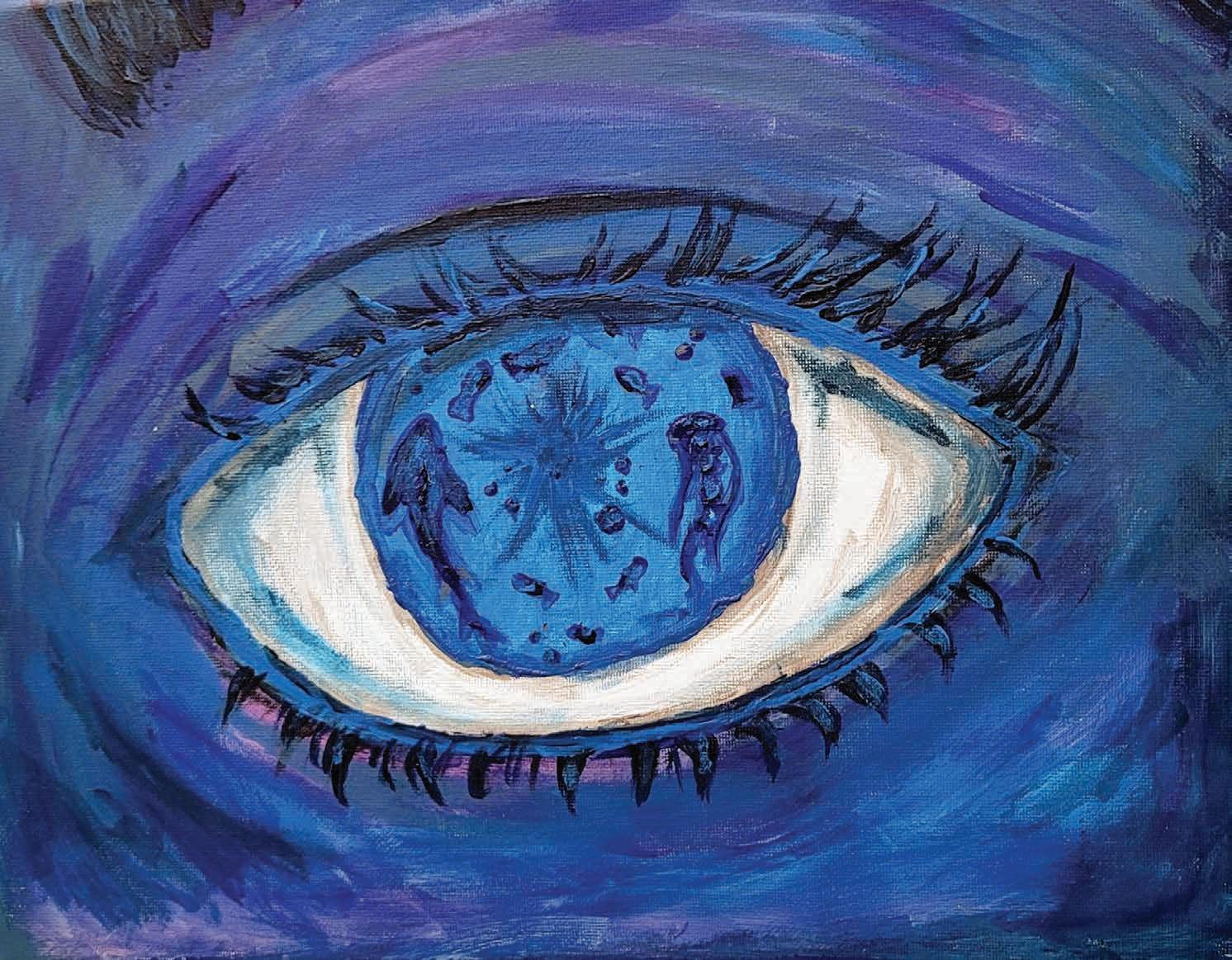 “Sacred insight” is how I see my health and wellness as a Métis youth. The eye shows vision and selfawareness, looking inward while staying connected to the world. Water is sacred in Métis culture. The swirling fish in the iris represent life, movement, and connection to nature.