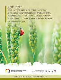 their respective regulations, ELCC programs in NB may offer curriculum based on Indigenous cultures — depending on the province’s approval — while programs in NT may waive equipment requirements for sleeping and napping arrangements if a child’s family prefers to use traditional Indigenous practices. In QC, as previously mentioned, agreements between the province and local First Nations may be entered to ensure ELCC programs reflect and account for “[Indigenous] realities” (Educational Childcare Act, 2005, s. 121). First Nations cultural representation is also required for ELCC programs in NL, as stated in the province’s early learning framework (NL Department of Education and Early Childhood Development, 2019).