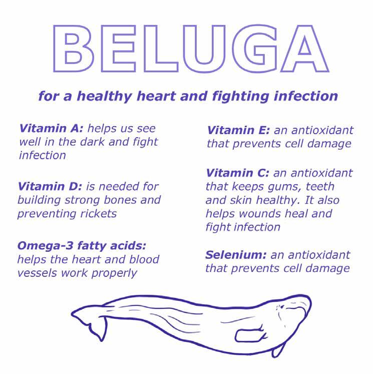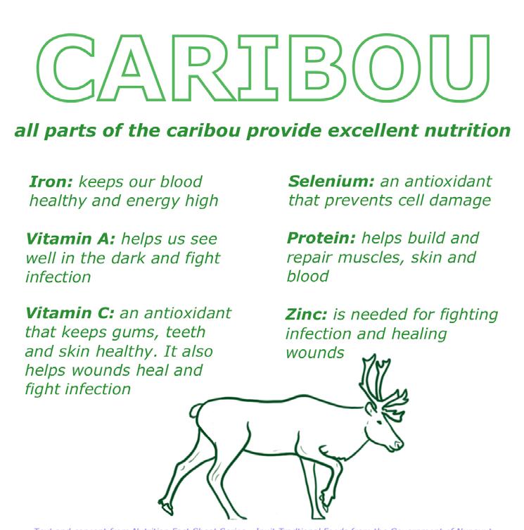 Une bonne alimentation est essentielle à une bonne vie. Les Inuits se sont toujours nourris de ce que la nature leur offrait. Les aliments traditionnels sont ce qu’il y a de mieux. Les enfants doivent être encouragés à les consommer, sous toutes les formes disponibles. Apprenez à vos enfants dès leur plus jeune âge à essayer différents types d’aliments traditionnels pour qu’ils y prennent goût. Les aliments vendus dans les magasins sont habituellement moins nutritifs. De mauvaises habitudes alimentaires conduisent à une perte d’audition, à des troubles d’apprentissage, à la formation de caries dentaires, à des problèmes de vision et à la maladie chez les enfants. Commencez tôt à leur présenter une variété d’aliments, donnez l’exemple de bonnes habitudes alimentaires et gardez dans votre demeure des aliments bons pour la santé.