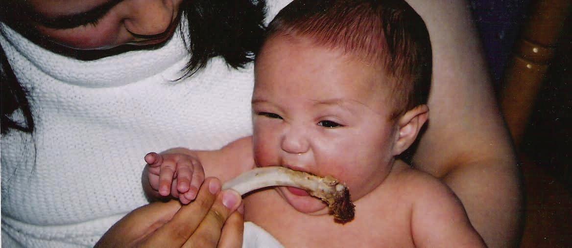Les aliments traditionnels sont très nutritifs et nourrissent les Inuits depuis des générations. Les parents enceintes sont en meilleure santé lorsqu’ils ont une alimentation riche en aliments traditionnels, et il en va de même pour les bébés lorsqu’ils se mettent à consommer ces aliments. Un bouillon animal fait à partir d’os est riche en moelle osseuse, en calcium et en matières grasses qui favorisent un bon développement. Souvent, le premier aliment solide que mange un bébé consiste en viande hachée mélangée à un bouillon pour former une pâte. Des chaudrées de poisson (sans arêtes) et des soupes réduites en purée constituent également un bon point de départ. Vous n’avez pas à saler ces soupes. Encouragez le bébé à ronger de gros os lorsqu’il perce des dents. En l’absence de caribou ou de bœuf musqué, vous pouvez utiliser d’autres aliments qui conviennent aux bébés et aux jeunes enfants, par exemple du petit gibier comme le lagopède, le lièvre et différents oiseaux, de même que du poisson. Cuisinez-les jusqu’à ce que leur chair soit très tendre et réduisez-les en purée ou hachez-les pour éviter tout risque d’étouffement.