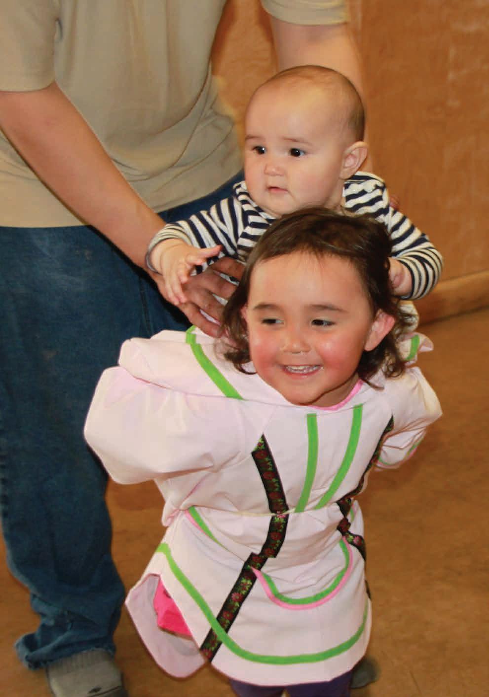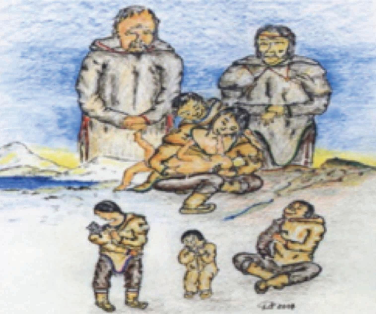 Les enfants grandissent entourés de gens, de places et d’événements qui tissent leur vie quotidienne et leurs perspectives d’avenir. Les enfants qui grandissent entourés d’amour et de bons soins peuvent survivre et s’épanouir dans un grand nombre de milieux différents. Les Inuits prennent soin d’établir un réseau de relations bienveillantes pour chaque enfant, ce qui renforce chez lui les sentiments d’attachement, d’appartenance et de protection.