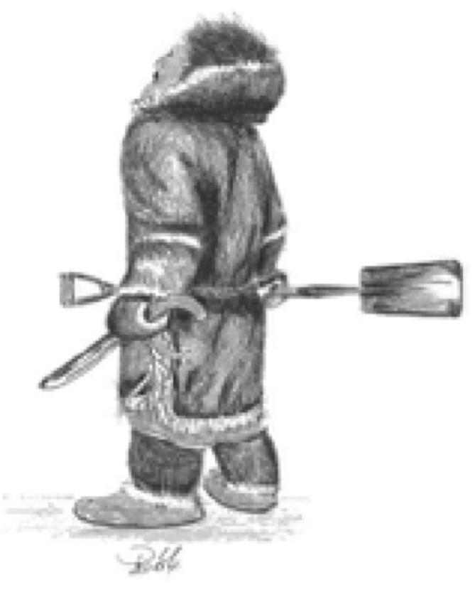 Un jeune homme était aperçu au campement chaque jour, une pelle dans une main, un pana dans l’autre. Nous espérions tous sa venue, parce qu’il déneigerait les portes, puis colmaterait les brèches et lisserait les côtés des igloos. Il était d’une grande aide pour tout le monde. Je n’ai pris conscience que beaucoup plus tard qu’il n’avait pas l’habileté de chasser comme les autres hommes. Il avait un rôle qui convenait parfaitement à ses capacités et il était très estimé pour les services qu’il rendait à notre communauté.