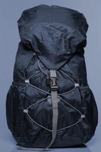 Water resistant poncho with adjustable hood, snap placket, and wrist snaps. Packs into chest pocket.