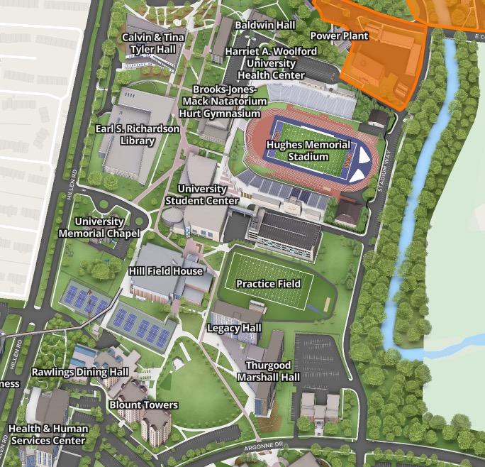 The West campus is accessible by the blue and orange pedestrian bridge that is adjacent to Hill Field House and crosses Hillen Road.