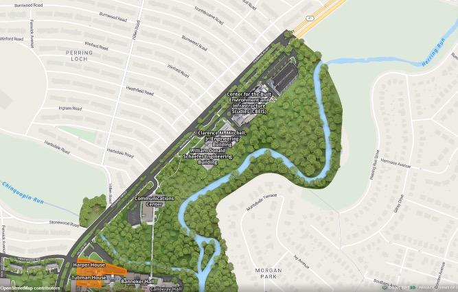North Campus is accessible by the pedestrian bridge next to Banneker Hall and crosses Chinquapin Run, a stream that runs through the campus.