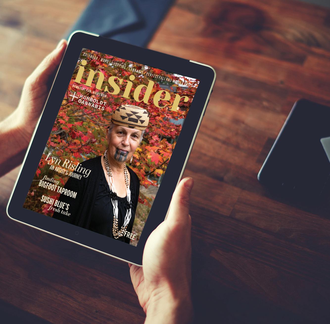 GRAB A SWEATER or better yet a hoodie and join us for another gorgeous fall and winter in Humboldt. Both the season and this issue of the Insider are packed with beauty and good times. We might even find you some snow, if you time your visit right.