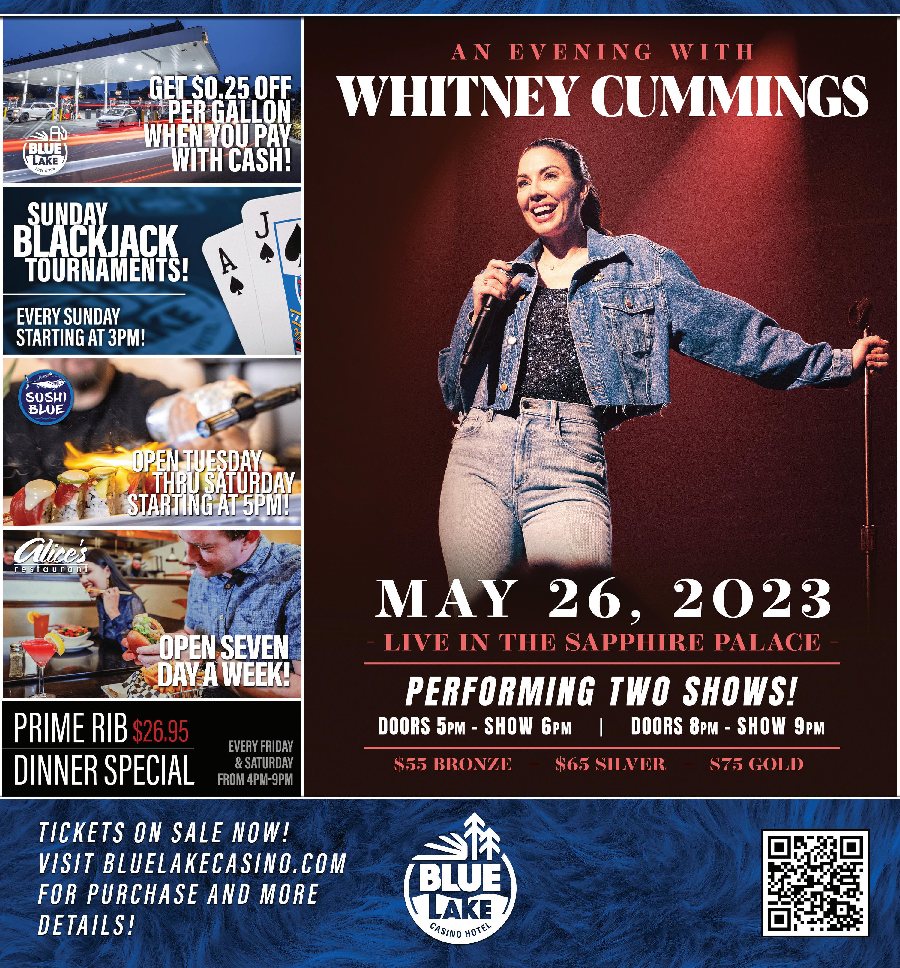 FRIDAY JUNE 2ND Tickets at WWW.FUNATTHEHEIGHTS.COM OR CROWN CLUB THE HEIGHTS CASINO PRESENTS BILLY BOB THORNTON & BILLY BOB & Entertainment Calendar 12 13 19 20 MAY Lost Dogs Local Blues & R&B DJ Pressure Your Favorite Dance Music Jimi Jeff Funk, Blues & Rock ‘n’ Roll Roland Rock Classic Good Time Party-Rock ‘n’ Roll, Blues, & Country Karaoke Every Tuesday Night 8PM Karaoke Every 8PM funattheheights.com | 1-800-684-2464 northcoastjournal.com • Thursday, May 11, 2023 • NORTH COAST JOURNAL 3