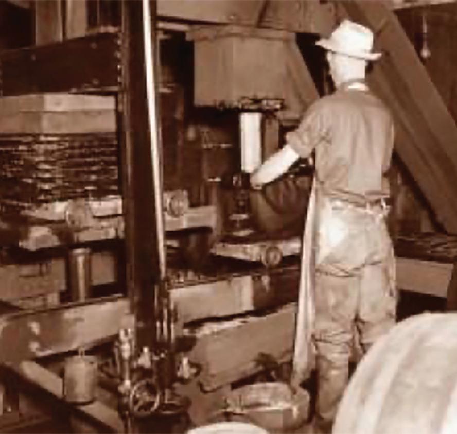 After struggling with a manual basket-type press for a few years, Ernest purchased the Mount Gilead No. 4-C Hydraulic Cider and Fruit Press in 1916, a room-sized machine that was shipped from Mt. Gilead, Ohio. Powered by an electric motor, it was capable of producing 100 gallons per hour, allowing uninterrupted pressing while the next batch was prepared.