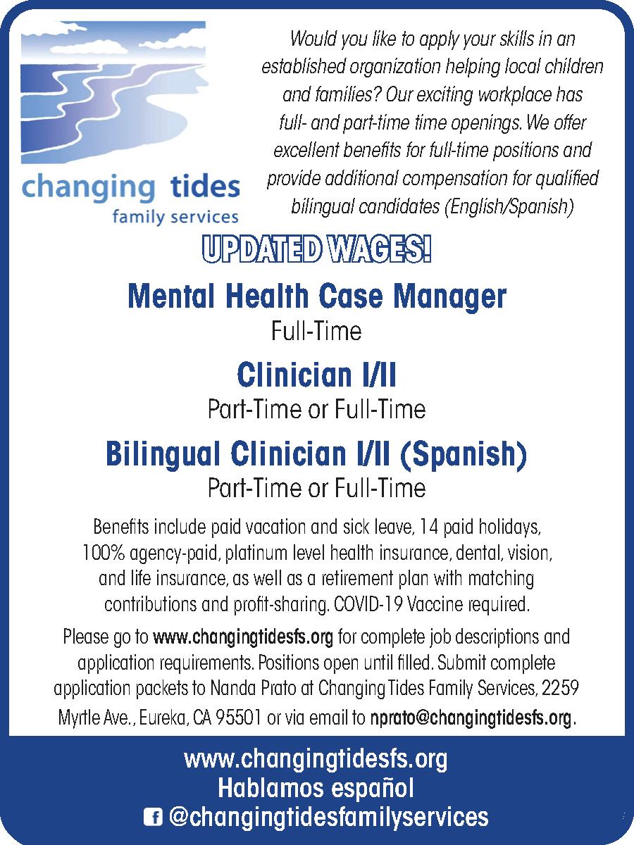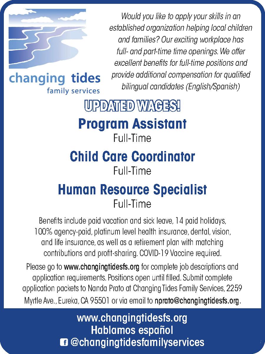 » Redwood Community Action Agency is hiring! ENERGY & ENVIRONMENTAL SERVICES DIVISION • Program Manager $30/hour F/T, 40/hrs. salary/exempt. • Intake & Outreach Specialist F/T 37.5 hours weekly $17/hr. • Energy Efficiency Retrofitting & Weatherization Field Crew F/T 40 hours weekly $18/hr. ADULT & FAMILY SERVICES DIVISION PROGRAM • Needs 2 Caseworkers $18.00/hr. 40-hour week COMMUNITY SERVICES DIVISION • Program Coordinator for Financial Literacy Project, 32 hrs/wk. with benefits. $18.50-$20.00/hr. DOE All F/T positions have health insurance. Go to www.rcaa.org for complete job descriptions & required job application. Positions are open until filled. Must be vaccinated for COVID. RCAA is an EOE Miscellaneous