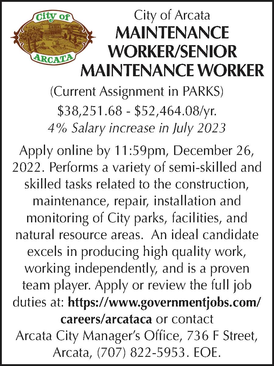 Apply online by 11:59pm, December 18, 2022. Coordinates, performs and supervises the daily functions of the City’s Treatment Plant Operations Division, including plant facility maintenance; the collection, treatment and disposal of the City’s wastewater, the treatment and distribution of the City’s water supply; and supervises the work of assigned staff. An ideal candidate excels in working and making decisions independently; in supporting professional growth of staff; and is a proven team player. Apply or review the full job duties at: https://www.governmentjobs.com/careers/ arcataca