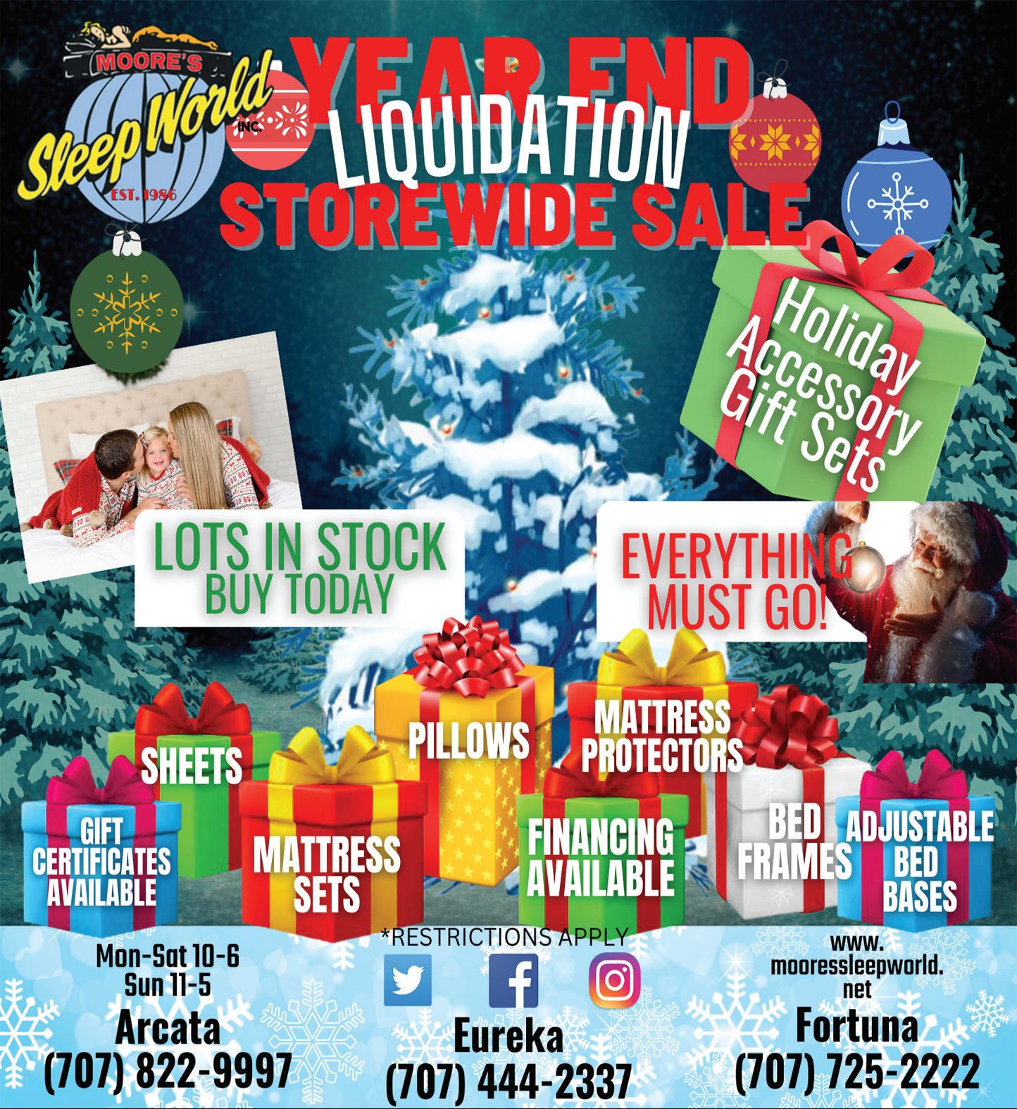 BRING YOUR HOLIDAY GIFT LIST! GIFTS for EVERYONE In All 3 Stores OUR BEST SELLER $10 OFF GEORGIA BOOT ”ROMEO” Styles #GR262, #GR270, #GR274 Men’s & Women’s Apparel from Columbia 25% OFF Men’s & Women’s Apparel 10% OFF “We Fit Humboldt” GIFT CARDS AVAILABLE Men’s & Women’s & MORE! ALL BOOTS & SHOES ON SALE FOOTWEAR 10% OFF 25% OFF Men’s & Women’s & Jackets, Coats, Vests & Hoodies ALL MEDICAL SCRUBS 20% OFF $5 OFF from Carhartt, Dickies, Wrangler Riggs WORK PANTS 20% OFF ALL KNIVES FLANNEL SHIRTS 25% OFF 10% OFF Women’s Dovetail Work Pants PENDLETON Men’s & Women’s Apparel 25% OFF and Blankets & Towels 6th & E Sts. Eureka • 444-9201 Mon–Sat: 9:30 - 7:30 • Sunday: 10:00 - 5:00 40 Years As Humboldt’s Work & Outdoor Outfitters Price Good Through 12/24/21 • Limited to Stock on Hand HOLIDAY HOURS thru DEC. 23 Mon-Sat 9:30 - 7:30 Sundays 10- 5 2 NORTH COAST JOURNAL • Thursday, Dec. 15, 2022 • northcoastjournal.com