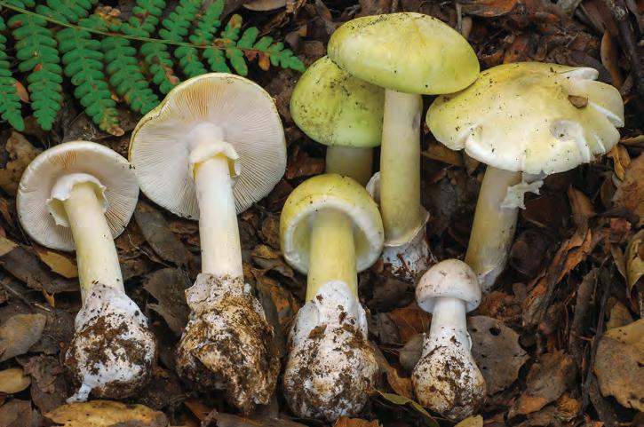 Toxic mushrooms, the death cap (Amanita phalloides) on the left and the western destroying angel (Amanita ocreata) above, at different stages of growth.