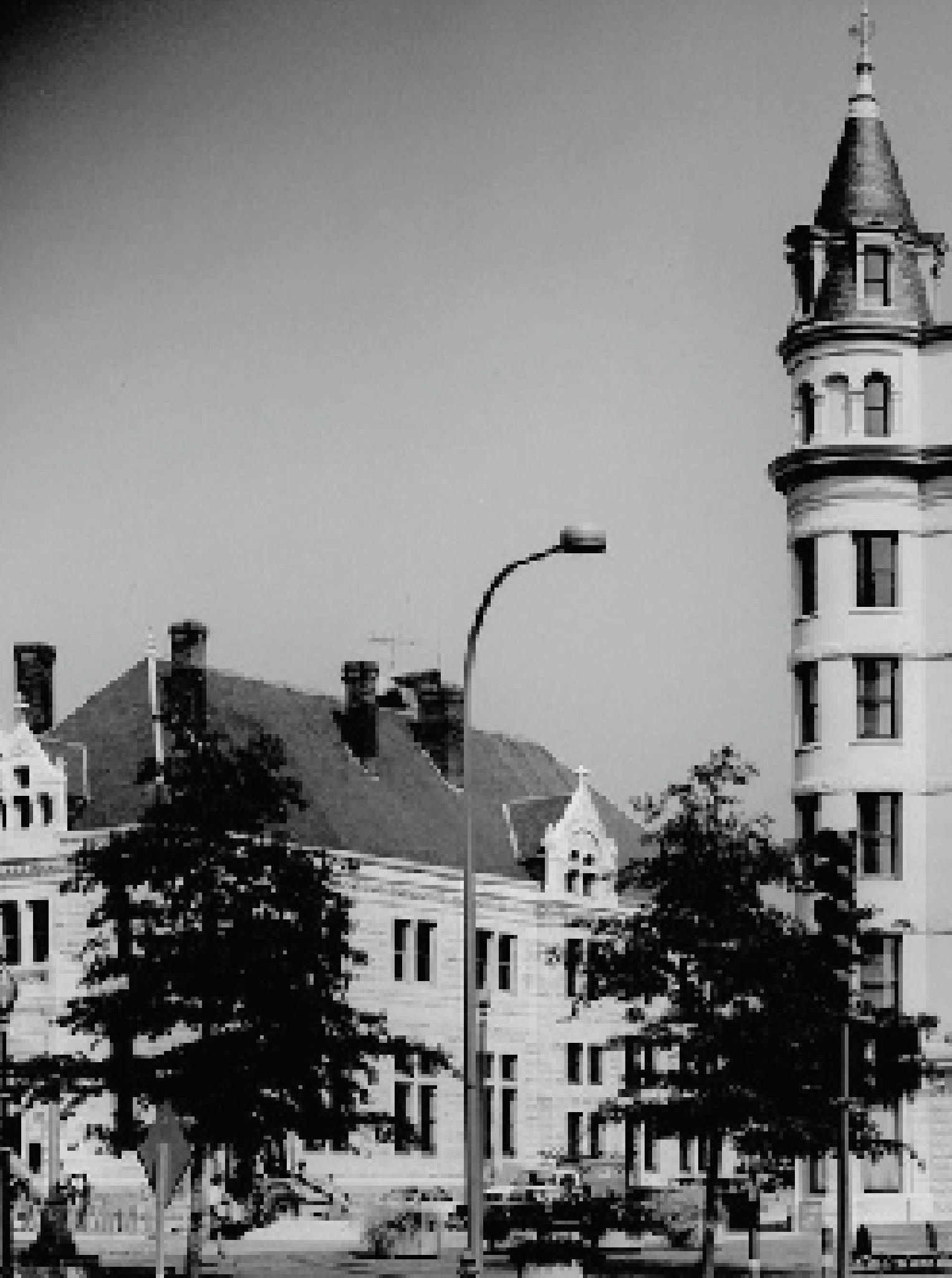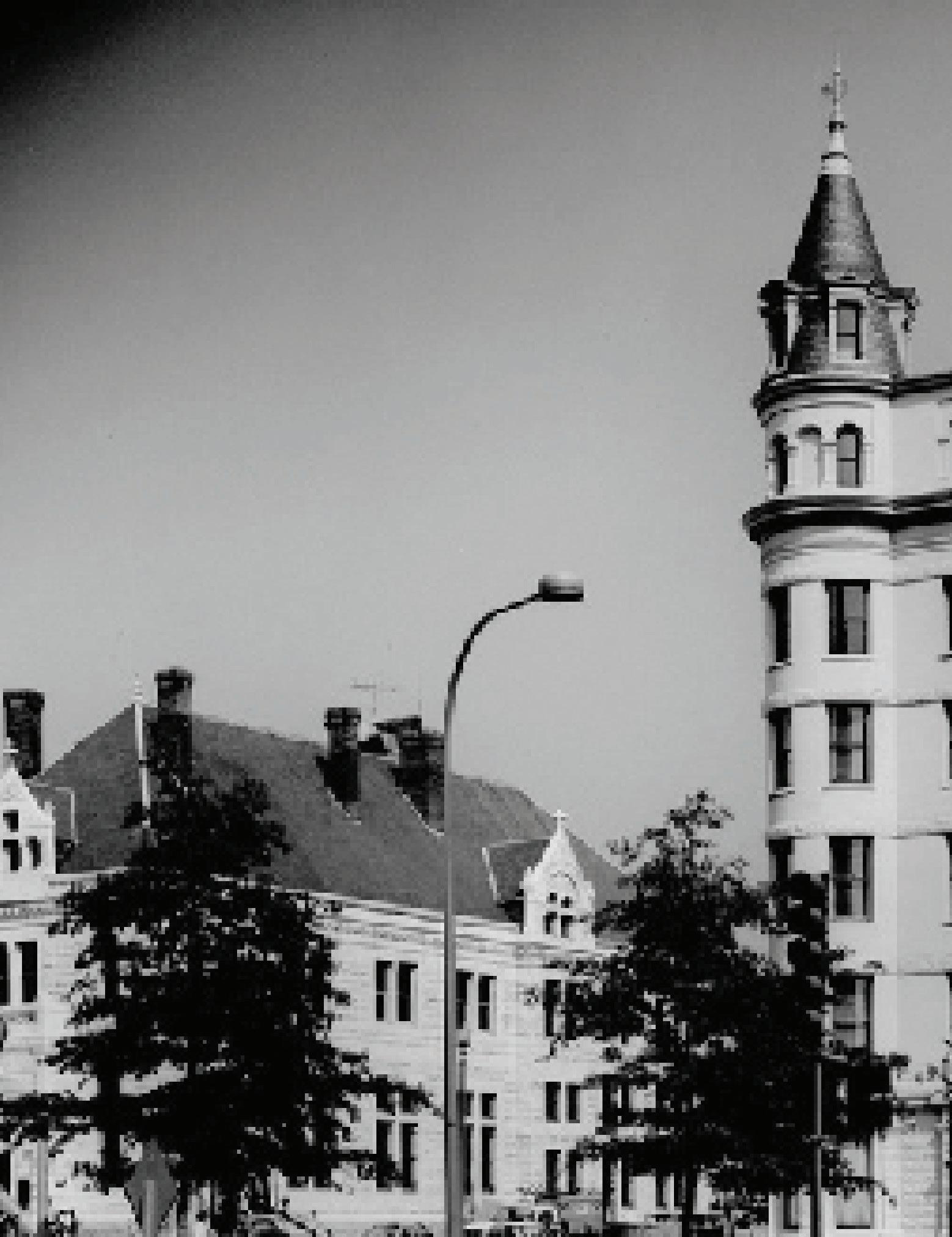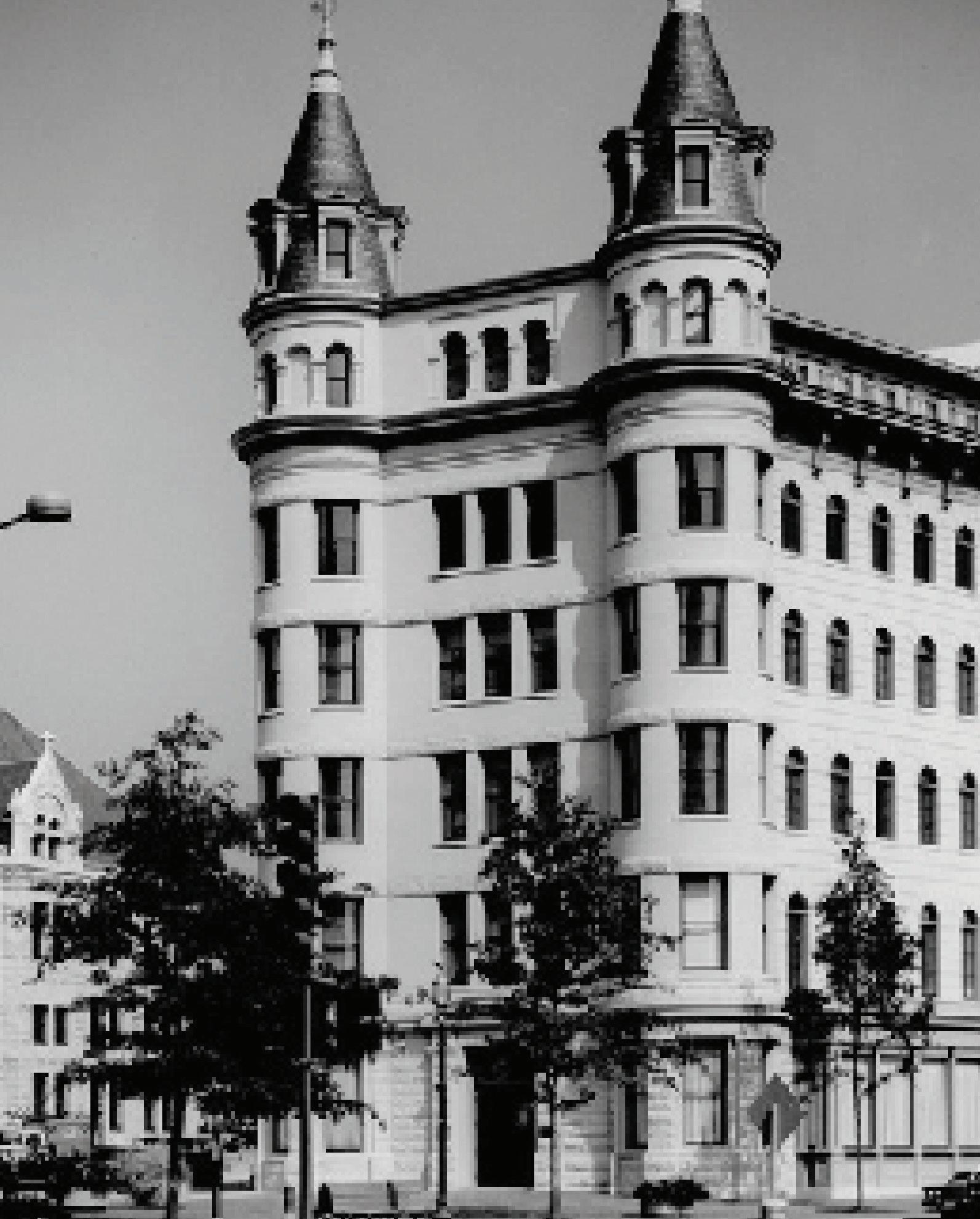 The past is very much present in the building. The original stone masonry and cast-iron trim can once again be appreciated by those passing the building. The signature twin turrets have also been restored. The original black slate roofs were reinstalled, and decorative cast iron spires were reconstructed.