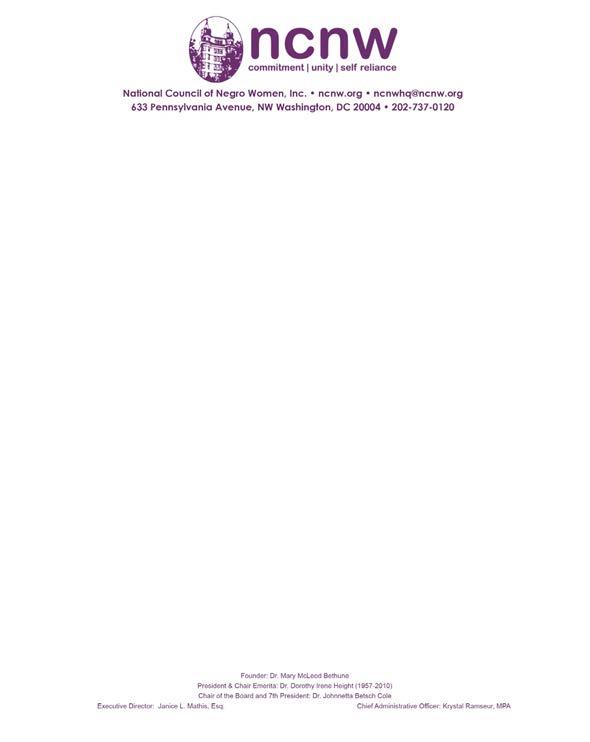 We often speak of NCNW as an “organization of organizations.” That phrase refers to NCNW’s role as conduit of its affiliates. It is that important nexus that gives NCNW the right to say that it speaks on behalf of women of African descent, their families and communities. Nevertheless, that phrase does not fully describe all of the constituencies that make up the NCNW family.