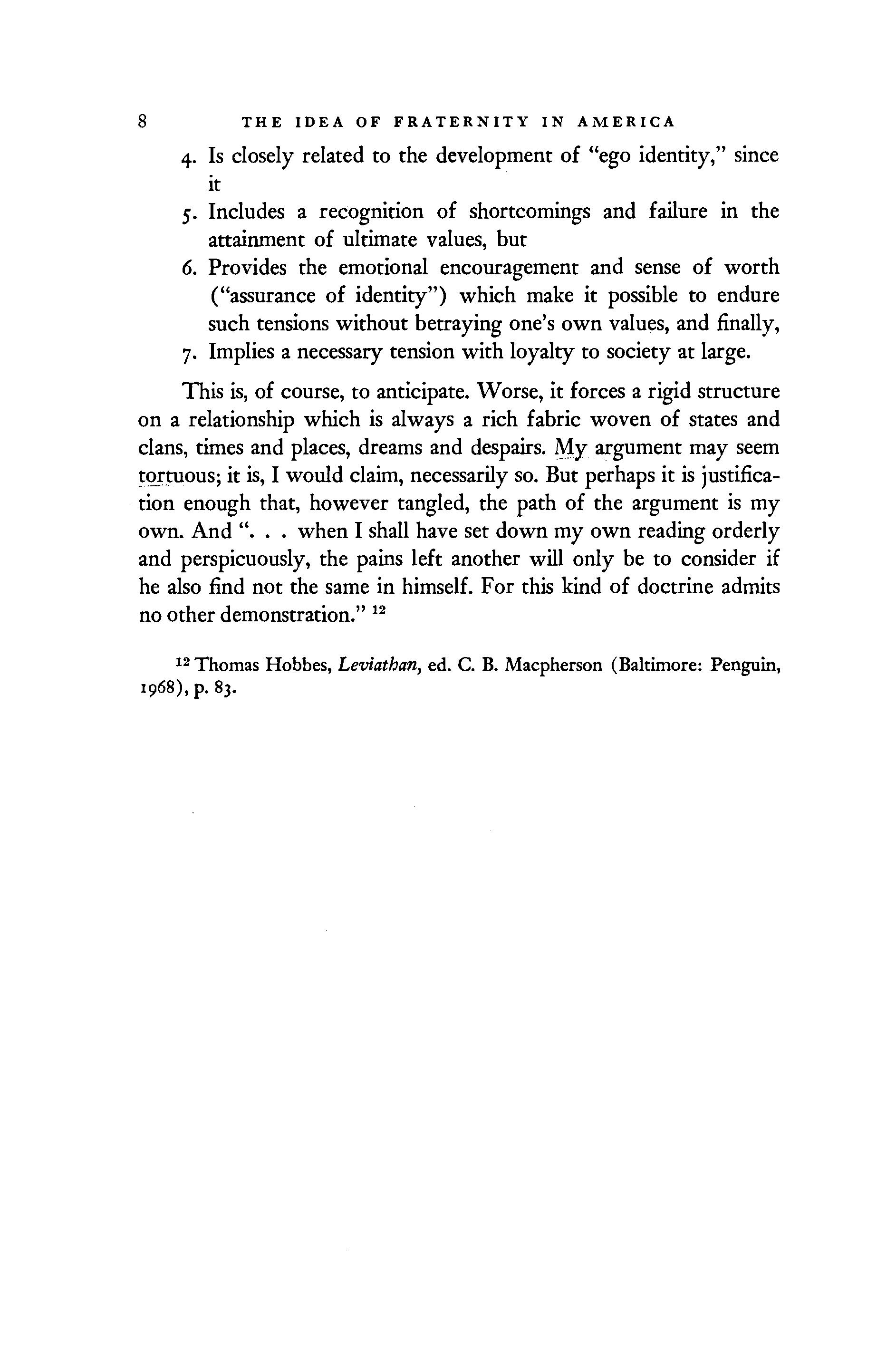 The question is not its own answer. It only implies, for those willing to ask, that it may be fruitful to begin at the beginning, to examine fraternity as it was seen by those who believed it to have a nature because they felt it as an immediate thing. When we have examined fraternity from that traditional perspective, that perspective in turn may be examined in terms of our own observations. And finally, it will then become possible to trace the labyrinthine path of fraternity as an idea in the life of America.