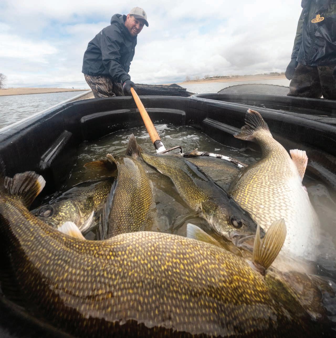 fisheries personnel got the walleye spawning process started on May 6 after a long winter and a delayed start to spring. According to Jerry Weigel, Department production/ development section supervisor, the egg take goal was 420 quarts of walleye eggs. That goal was easily surpassed as crews tallied 464 quarts, or roughly 56 million eggs. While the bulk of the eggs came from Lake Sakakawea fish, 107 quarts were collected at Devils Lake.
