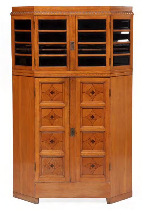 1. Jugendstil Inlaid Oak Vitrine Cabinet, c. 1910, attr. to Bruno Paul, ebony-inlay, double-trapezoidal case, upper case with beveled glass doors, paneled lower case, conforming base, h. 62 in., w. 39 1/2 in., d. 26 in. [$1000/1500]