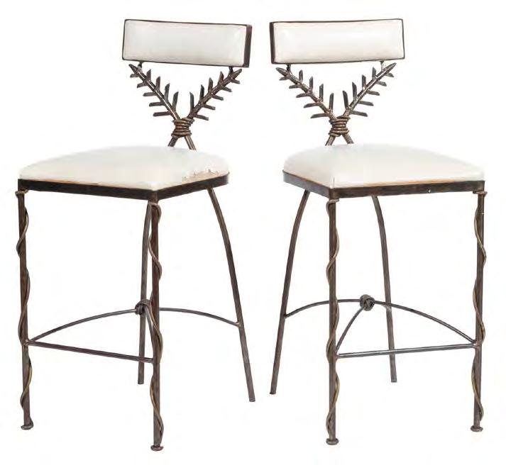 12. Pair of French Art Moderne Lacquered Wood and Gilt Metal Lamp Tables, c. 1950, manner of Eugene Printz and Jean Durand, plinth top, spherule and scroll apron, arched base, h. 32 3/4 in., w. 45 in., d. 25 in. [$3000/5000]