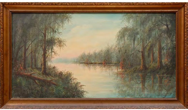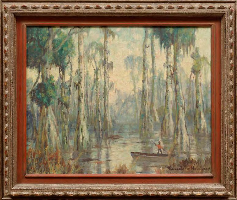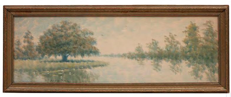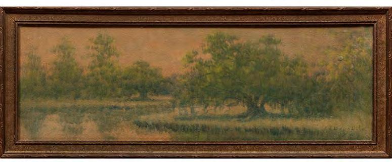 52. William Didier-Pouget (French, 1864-1959), “Le Matin sur l’Etang en Dordogne (Bruyeres en fleurs)”, oil on canvas, signed lower right, monogrammed and titled en verso, 21 1/4 in. x 25 5/8 in., framed with artist plaque, overall 28 in. x 32 1/2 in. x 2 7/8 in. [$2500/3500]