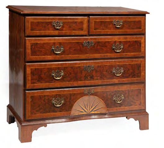 27. Dutch Rococo Burlwood Bombe Chest of Drawers, 18th c., shaped top, serpentine stiles, conforming case with four drawers, ball and claw feet, h. 32 in., w. 33 in., d. 20 in. [$1000/1500]
