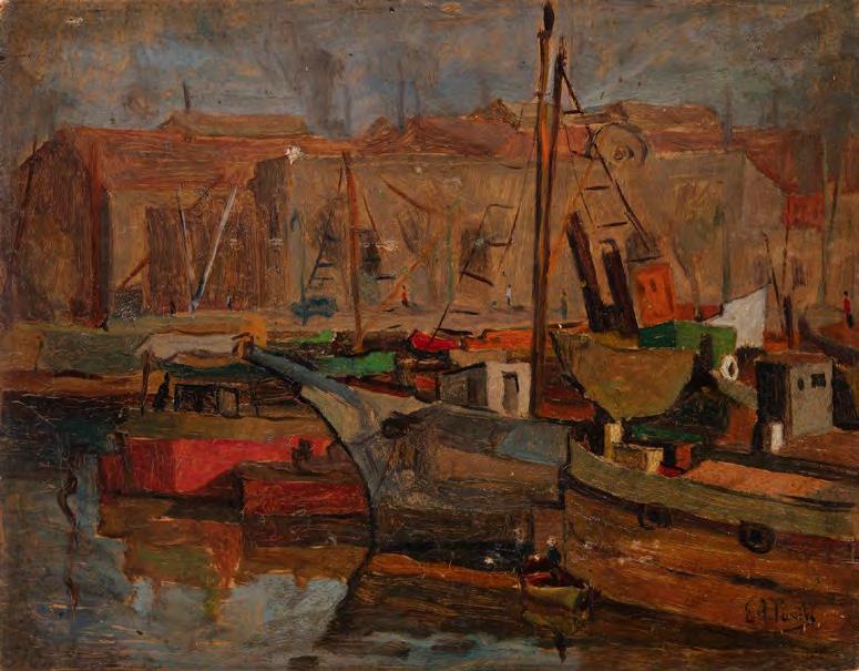 55. Attributed to Elie Anatole Pavil (Russian/French, 1873-1948), “Ships in the Harbor”, oil on board, signed lower right,
