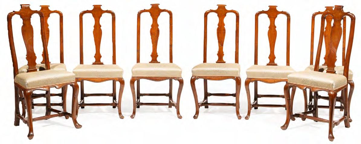 28. Eight Dutch Rococo Carved Walnut Side Chairs, 18th c., scrolled crest, vasiform splat, cabriole legs, turned stretchers, h. 43 in., w. 20 in., d. 16 in. [$1200/1800]