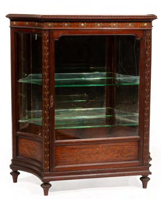 34. Antique Louis XV-Style BronzeMounted Marquetry and Kingwood Vitrine Cabinet, stepped flared top, curved glass sides and door, glass shelf interior, conforming case, cabriole legs, sabots, h. 68 in., w. 30 in., d. 21 in. [$700/1000]