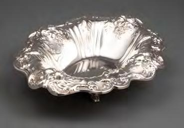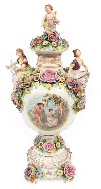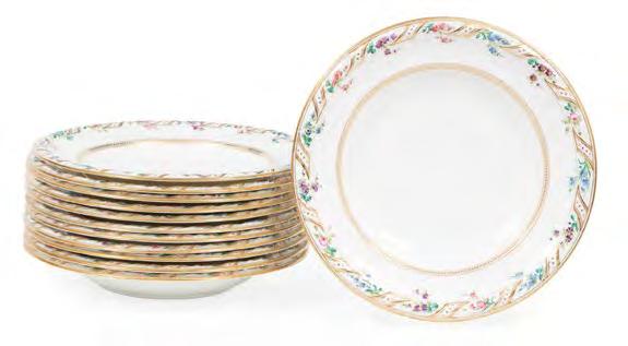 61. Large French Gilt and Polychrome Porcelain Center Bowl and Stand, early 20th c., mark of Jean Pouyat, Limoges, stand with dedication “To. Mama. from Sidonia. To be given to Germone on his twenty first birthday”, h. 10 1/2 in., dia. 15 1/2 in. [$300/500]