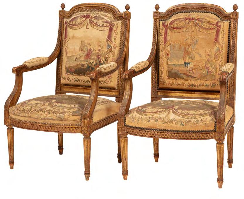 2. Pair of Louis XVI Carved Giltwood Fauteuils, late 18th c., arched crest rail, acorn finials, scrolled arms, guilloche seat rail, fluted tapered legs, needlepoint upholstery, h. 38 1/4 in., w. 24 in., d. 21 in. [$1600/1800]