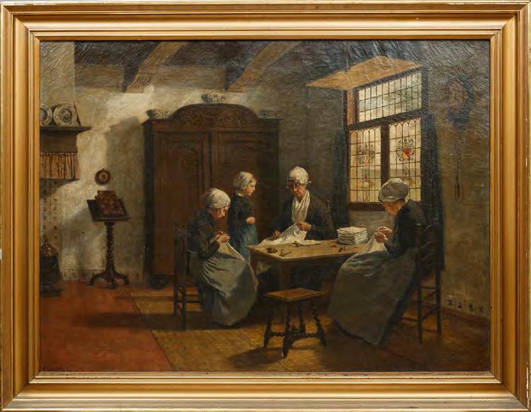 Mauritius Salk (Dutch, 1864-1938), “The SewingSchool at Katwýk”, oil on canvas, signed lower left, after David Adolph Constant Artz (Dutch, 1837-1890), inscribed “Copy after DAC Arts [sic]” lower right, titled en verso, “L. Uter’s Heirs, 233 & 235 Royal Street, New Orleans” label on reverse of frame, 38 in. x 51 1/2 in., framed, overall 45 3/4 in. x 59 in. x 3 in. [$1000/1500]