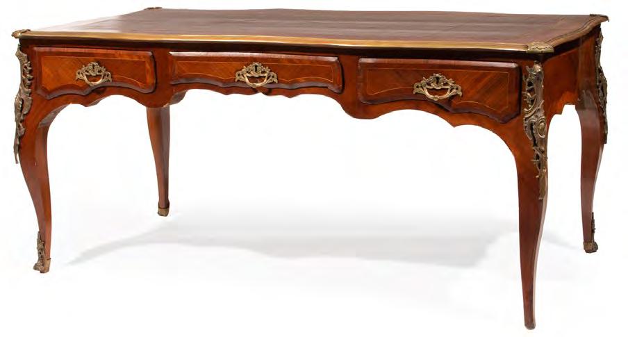 1. Antique Louis XV-Style Bronze-Mounted Kingwood Bureau Plat, inset tooled leather top with acanthine corners, serpentine frieze with three drawers, reverse with faux drawers, cabriole legs, sabots, h. 30 in., w. 65 in., d. 32 in. [$800/1200]