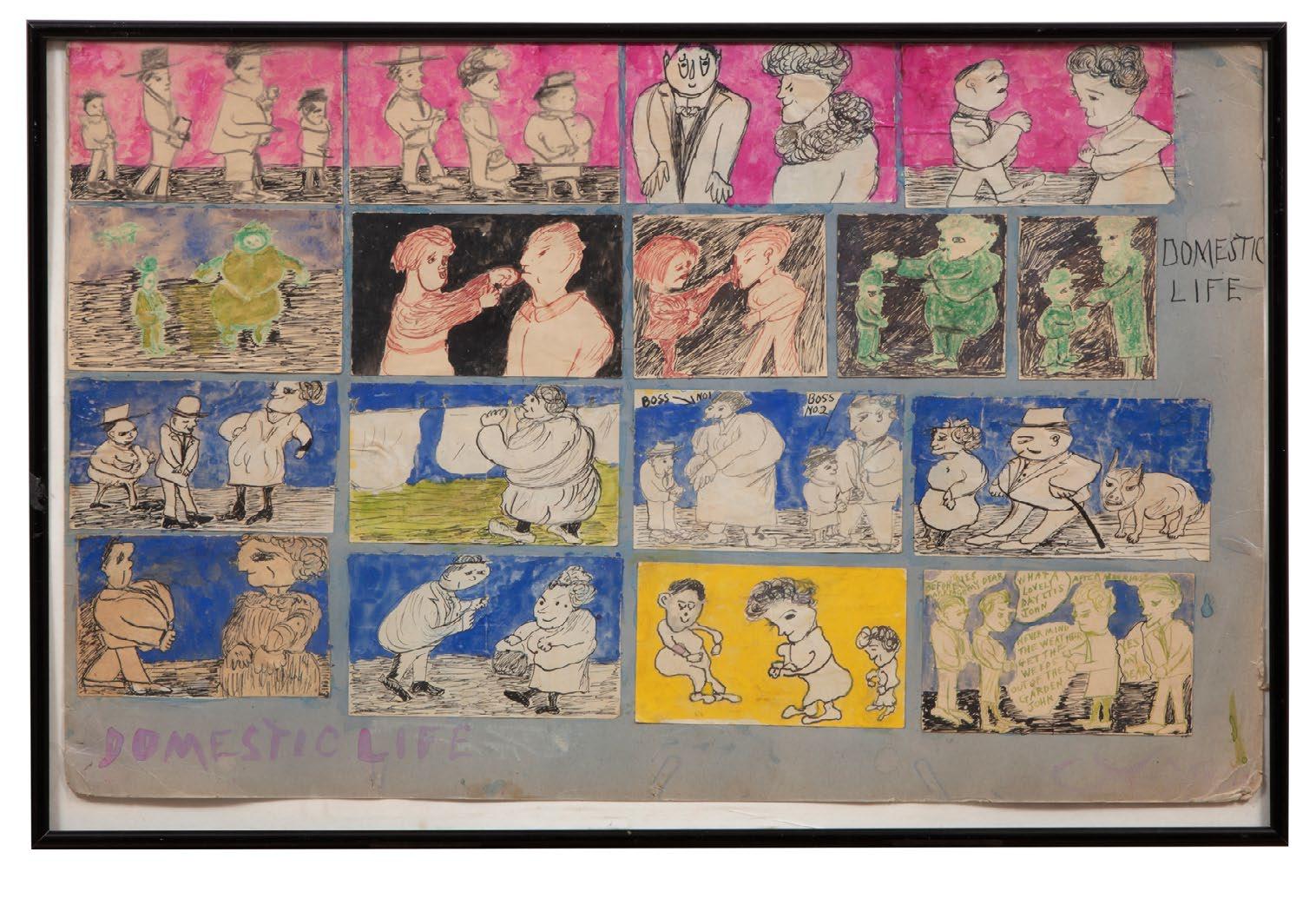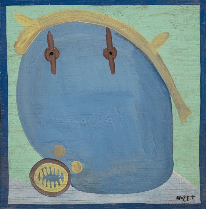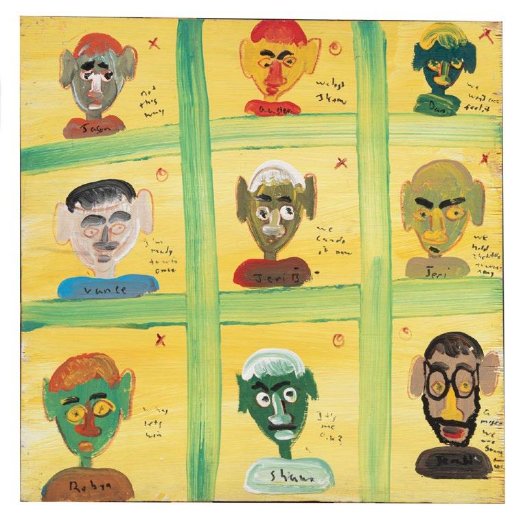One day, his father bought him some brushes and house paint to use as a means of art therapy. Beverland, having found an outlet for his creative expression, executed a body of work whose joyful lightness and clarity can be seen in museums and galleries across the country. His most popular subjects were angels and magical cats and dogs, but he often painted friends and family as well, as in the lot here entitled “Portrait Grid.”