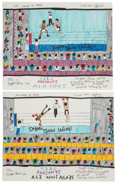 Note: Winfred Rembert’s deeply personal and visually striking art emerges from his experience growing up in the American South during the Jim Crow era and often celebrates his birthplace of Cuthbert, Georgia. Rembert survived a near-lynching and seven years in the Georgia prison system—experiences that he documented in his memoir, Chasing Me to My Grave, which was awarded a posthumous Pulitzer Prize in 2022. After his release from prison and with encouragement from his wife, Rembert utilized leatherworking techniques that he learned from a fellow prisoner to create autobiographical artwork from cut, tooled and dyed leather. While some of his powerful pieces recall the harsh and tragic elements of his past in the South, Rembert’s art also depicts the joyous aspects of Black life in the 1950s— “the strong family and community bonds, the cultural vibrancy, and the many colorful characters that lifted the spirits of those who had little choice but to labor in the region’s cotton and peanut fields.” The work offered here, titled “Cuthbert Memory,” portrays those happier times in Cuthbert, as with a few simple, yet expertly rendered, lines and marks Rembert provides a feeling of community, dialogue and nostalgia—a memory and a story now forever captured on leather. Through Rembert’s conscious decision to leave the piece in its natural color, his ease with his craft shines, and his touch is clearly seen and intimately felt. One can viscerally grasp the toiling and hours needed to render and manipulate the leather and imagine the work in progress in the artist’s capable hands.
