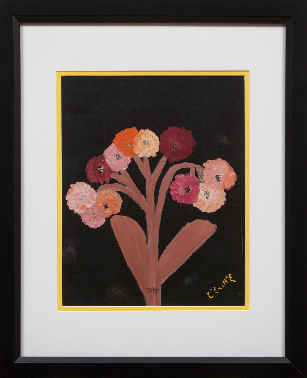 47. Clementine Hunter (American/Louisiana, 1886-1988), “Early Zinnias”, oil on paper, monogrammed lower center, inscribed “Clemence” lower right, 14 1/2 in. x 11 1/4 in., framed, overall 22 3/8 in. x 18 3/8 in. x 1 in.