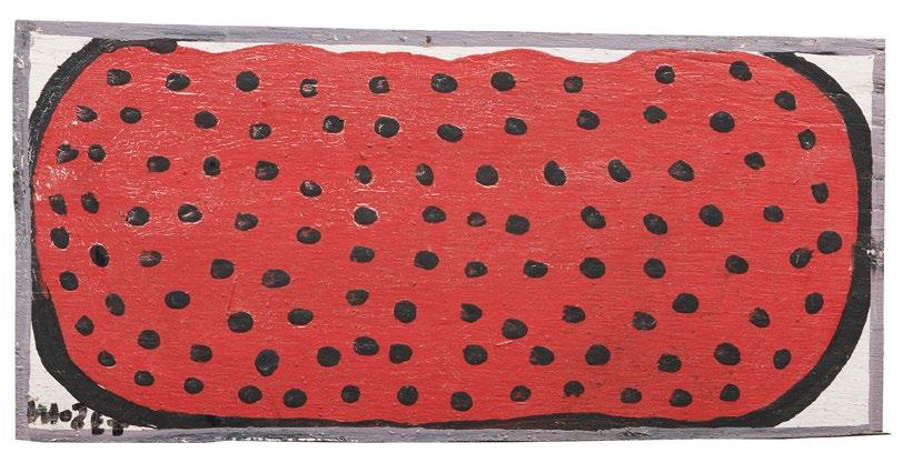 13. Mose Tolliver (American/Alabama, 1920-2006), “Beige Dog”, oil on panel, signed lower right, 3 1/2 in. x 17 3/8 in., unframed. [$400/600]