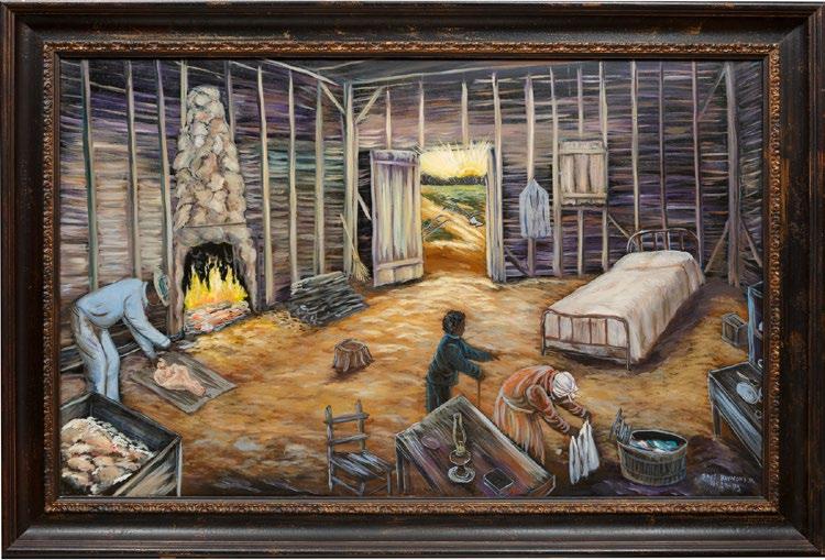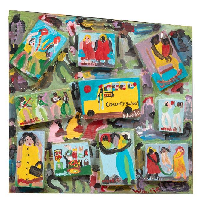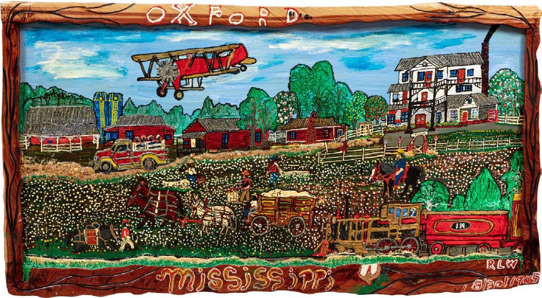 surroundings. In the work offered here, Wrenn depicts a landscape of Oxford, Mississippi in 1945 in a vibrant palette and with a strong attention to detail. The layered composition merges the historical past with current day while the added gravel in the surface of the roadway and widely varying styles of mark-making provide textural and dynamic components. The artist’s characteristic painted frame identifies and contains the scene which serves as a particularly strong example of