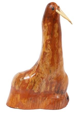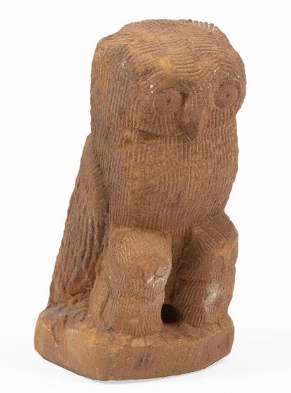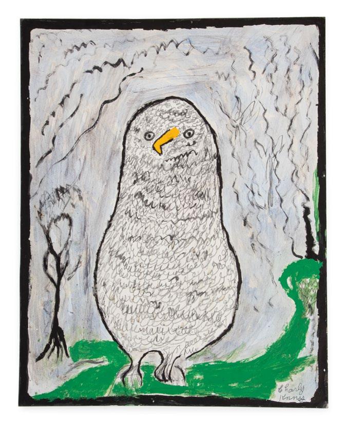Note: Charley Kinney was born in Lewis County, Kentucky, and before 1912, his family had moved less than a mile to where he would spend the remainder of his life. He showed artistic interest at an early age, preferring to draw rather than study during his three or four years of schooling. Spending his entire life virtually in the same spot and living off the land, Kinney developed an intimate knowledge of the surrounding landscape and a keen connection to the natural environment of rural Appalachia. His work features the animals that inhabited the area alongside him, both real and imagined. Supernatural beasts or “haints” were often the subjects of Kinney’s art, fueled by his extraordinary imagination. Kinney’s painting flourished from the 1970s until his death, and his local critters, such as the owl offered here, are among his most resonating works. Ref.: “Charley Kinney (1906-1991).” Roots Up Gallery www.rootsupgallery.com. Accessed Jan. 31, 2023.