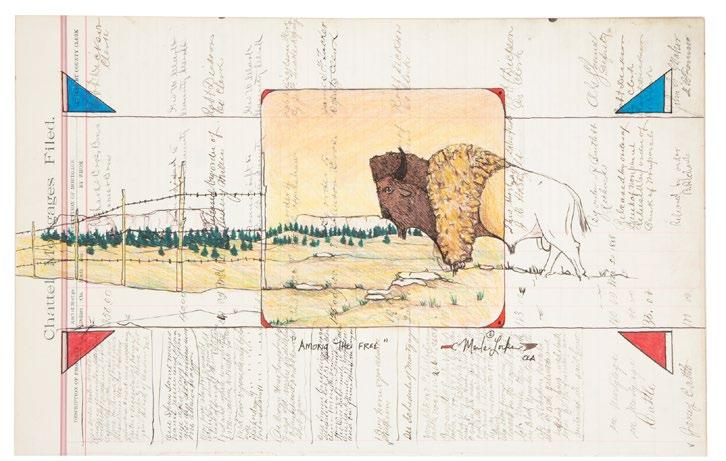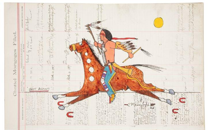 Locke’s body of work builds on the traditions of Ledger Art, and in the work offered here, Locke overlays an image of a warrior galloping on a horse on a piece of antique ledger paper. Surrounding him are two dragonflies whose skewed scale lend a mystical quality to the composition. For Locke, dragonflies signify hope and prosperity. “Historically, when warriors went into battle they were surrounded by dragonflies. The warriors would try to move like the dragonfly, so that they would be impossible to shoot.”