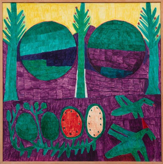 Note: Originally from Natchez, MS, Willie White eventually moved to New Orleans where he worked as a waiter then janitor and sign painter. In the early 1950s, inspired by the artists he saw in the French Quarter, he decided to try his hand at painting. White eventually developed his own iconography featuring a combination of organic forms like animals and plants as well as technology such as rocket ships and skyscrapers. By the early 1960s, White settled on his preferred medium of felt tip marker on poster board, only rarely using canvas when it was provided to him, as in the lot on offer here. This work is remarkable in its size, color and clarity. The composition is almost symmetrically laid out, with three trees vertically splitting the upper half of the canvas while the bottom half features the artist’s characteristic dinosaurs, plants and watermelons all rendered in vibrant technicolor hues.