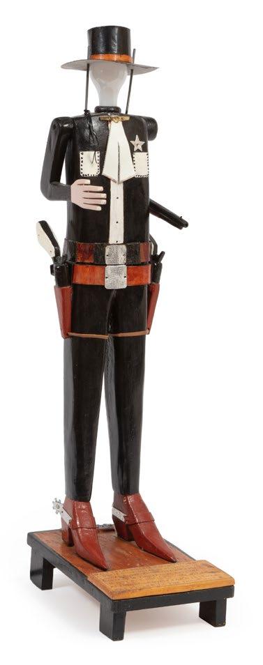 20th c., “Wyatt Earp Lamp”, mixed media and painted wood, unsigned, pencil-inscribed on wood plaque on base, h. 34 in., w. 8 in., d. 12 5/8 in. [$400/600]
