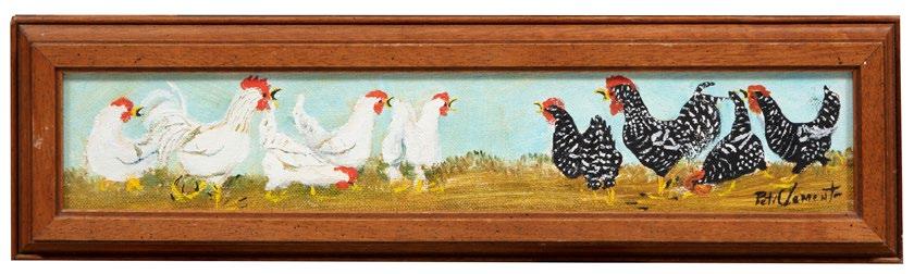 49. Clementine Hunter (American/ Louisiana, 1886-1988), “Big Chicken Pulling a Wagon with Flowers”, oil on canvas board, monogrammed lower right, 14 in. x 18 in., framed, overall 18 in. x 22 in. x 1 1/4 in. [$3000/5000]