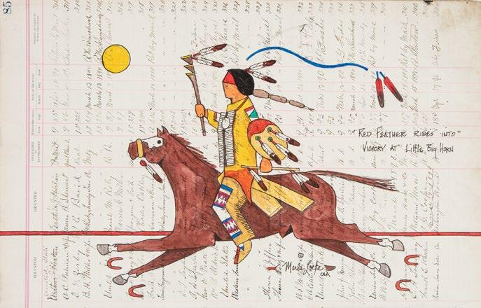 Note: Merle Locke is a member of the Oglala Lakota tribe and grew up in the Pine Ridge Reservation in the southwestern part of South Dakota. He uses traditional imagery to tell the tale of his ancestors and continue the storytelling customs of his community. He typically works in Ledger Art, which emerged in the 1860s in the Great Plains region. Originally, painted buffalo hides were the preferred media, but as more occupiers settled into the surrounding territories, they brought ledger books filled with paper. These books became the popular vehicle of communal drawing with each one containing the shared works of several different artists and authors. The drawings often featured images from battle exploits and daily minutia within the tribe.