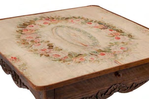 65. Antique French Provincial Carved Walnut Games Table, inset needlepoint top, frieze with drawer and shell decoration, foliate cabriole legs, h. 27 1/2 in., w. 32 in., d. 32 in. [$600/900]