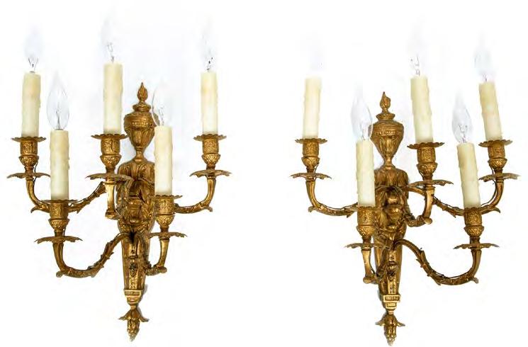 60. Pair of Louis XVI-Style Bronze Five-Light Sconces, flame and urn backplate, foliate arms, h. 18 in., w. 13 in. d. 9 1/2 in. [$600/900]
